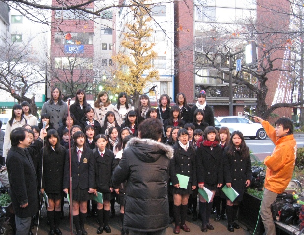 イルミネーション点灯式中学&高校合唱部が「もろびとこぞりて」と「瑠璃色の地球」を演奏いたしました。大学通りを通る多くの方が、足を止めて私たちの演奏を聴いてくださいました。